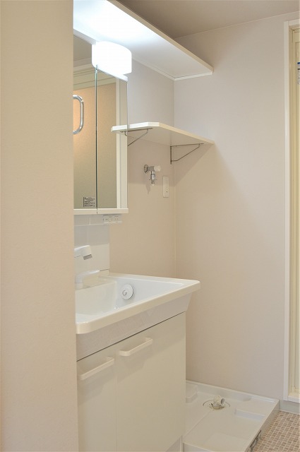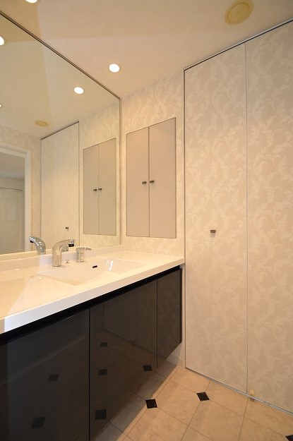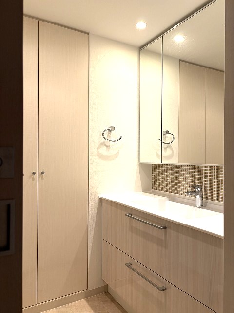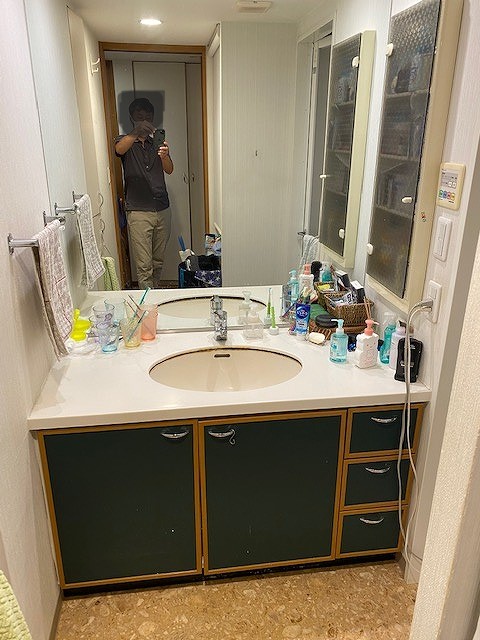 そして幅110㎝以上の洗面台。正面に広い一面の鏡が貼られ、サイドに埋めこみ式の収納がついたこんな形の洗面台。2000年前後に建てられたマンションでよく見かける形です。