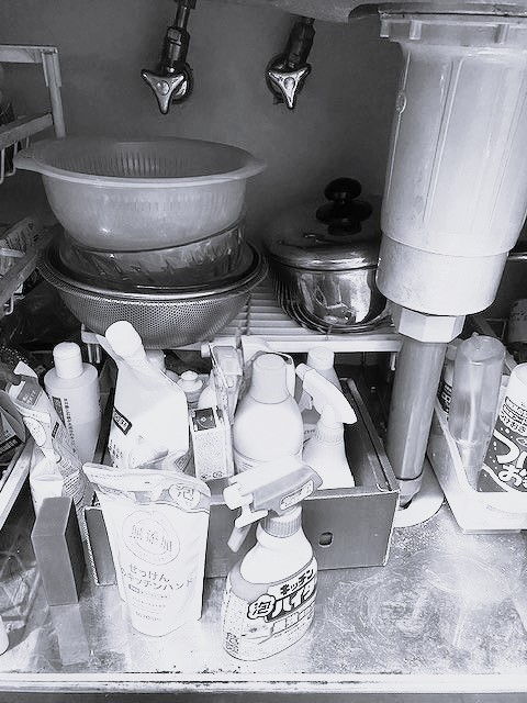 こちらはキッチンキャビネット内部です。こちらはシンクの中央に丸い排水口があるタイプですので、収納の真ん中に排水管がズドンと通っています。新しいキッチンは排水管を奥に設置することで収納を増やす工夫がなされています。