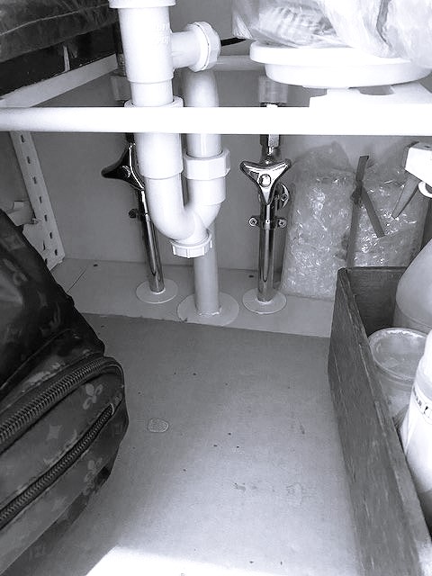 こちらは洗面台のキャビネットを開けたところですが、奥に3本の配管が見えると思います。真ん中の太い管が排水管。その左右にある2本が給水、給湯配管です。ほとんどの場合左がお湯、右がお水です。
