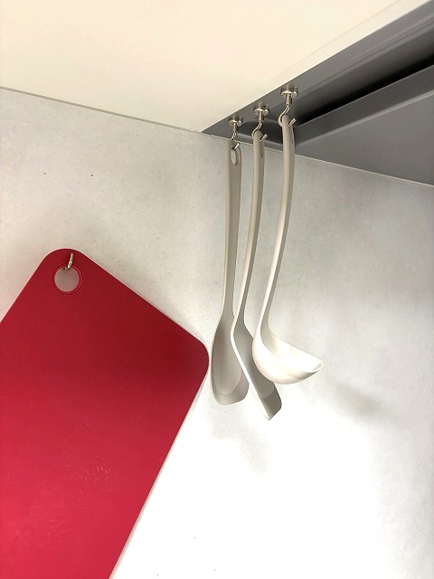 もう一点、BEFOREを拝見して感じていたこと。以前はラックだったのでS字フックでエプロンや布巾などを「掛けて」お使いでした。今回は掛ける場所がなくなってしまいます。そのため壁のキッチンパネルをマグネット対応にし、さらにゴミ箱の後ろにも1枚パネルを追加して貼りました。